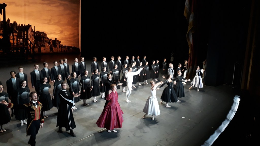 Le deuxième acte s’articule principalement autour d’une grande scène de bal, l’occasion pour le corps de ballet de montrer toutes ses qualités après quelques désynchronisations lors des premières représentations, tandis qu’apparait l’arrogante Mathilde de la Mole, un rôle incarné à la perfection par Myriam Ould-Braham (qui là encore délaissera vite l’affiche, donnant à Bianca Scudamore l’opportunité de s’y montrer tout aussi brillante). Dans le trop petit rôle de la maréchale de Fervaques, aussi bien Camille Bon qu’Héloïse Bourdon font preuve de belles qualités qui donnent envie de les voir évoluer dans des rôles avec plus d’ampleur. Si l’évolution de l’intrigue s’alourdit parfois dans les détails, le tout est agréable, et la scène du régiment, si elle n’apporte rien du point de vue de la dramaturgie, est l’occasion d’ajouter à la superbe de la production avec de clinquants uniformes.