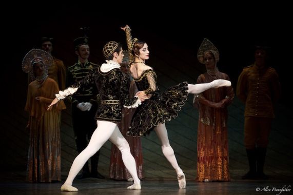 Dans le second acte, les différents rendez-vous galants sont l’occasion d’un mélange assez réussi entre classique et danses de caractère, avec des effets comiques bon enfant mais efficaces (le déguisement de chien, un peu excessif, pourrait être lassant, mais au final on rit de bon cœur). Le clou du spectacle est un passage dansé par le danseur travesti en sylphide. Ça pourrait être trop, mais c’est terriblement drôle, sans sacrifier pour autant la danse au comique car la variation, sur pointes, reste solide, et Ruslan Skvortsov l’exécute avec brio et beaucoup d’humour.
