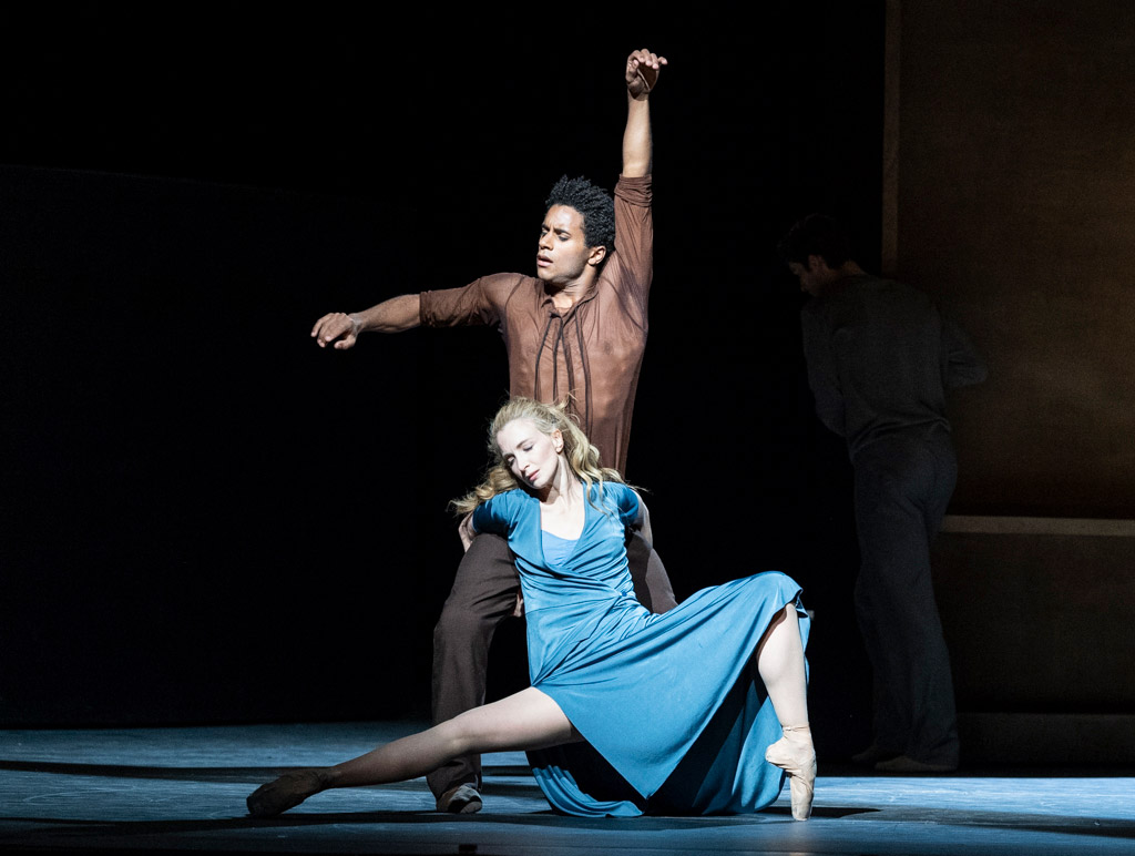 Ainsi, dès les premières scènes, le magnétique Marcelino Sambé, qui bien plus que l’instrument en lui-même matérialise l’âme du violoncelle, vient s’imposer comme une évidence à la lumineuse Lauren Cuthbertson, dont la ressemblance physique avec Jacqueline du Pré est troublante. Tout repose sur une pose savamment étudiée où Marcelino Sambé, un genou à terre et un bras tendu vers le ciel, imite la forme de l’instrument. La magie opère et l’on croit voir Lauren Cuthbertson jouer du violoncelle. La relation entre les deux devient vite fusionnelle au travers de superbes pas de deux à la tonalité emprunte d’affection, qui sauvent les tons un peu ternes du reste de la pièce. L’apogée est atteinte lors d’une scène de concert, moment de la rencontre avec Daniel Barenboim, que Matthew Ball interprète avec juste ce qu’il faut de suffisance. Le corps de ballet, dont il est dommage qu’il soit par ailleurs sous-exploité dans ce ballet, s’anime par groupes au rythme du concerto d’Elgar, donnant vie à tout un orchestre qui est évoqué sans être mimé, pendant que sur deux piédestals chef d’orchestre et soliste se répondent et se séduisent mutuellement. La scène se poursuit par un pas de trois au cours duquel le violoncelle semble soutenir et cimenter la relation amoureuse entre Du Pré et Barenboim, une interprétation qui renvoie à la richesse de leur collaboration musicale.
